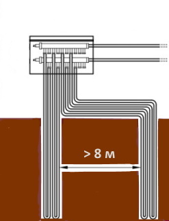 Если у нас предусматривается установка нескольких геотермальных зондов, то они должны располагаться на расстоянии не менее 8 м друг от друга. Делается это для того, чтобы избежать термического воздействия зоднов между собой, и, как следствие, уменьшения их эффективности.