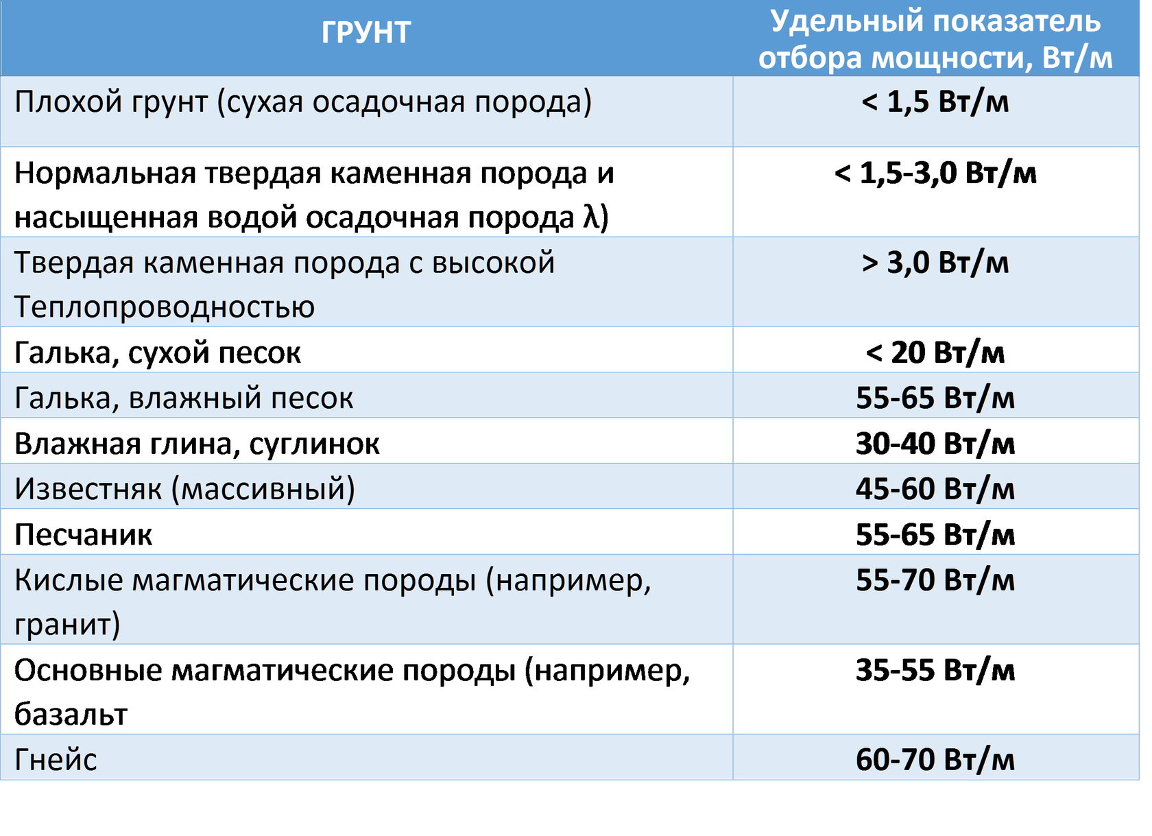 Рассмотрим пример расчёта геотермального зонда в виде двойной U-образной трубы. Средний отбор мощности q = 50 Вт/м длины зонда, мощность теплого насоса берём за N = 5,0 кВт. Длина зонда составит L=N/q, то есть 5000 разделить на 50, равно 100 метров.