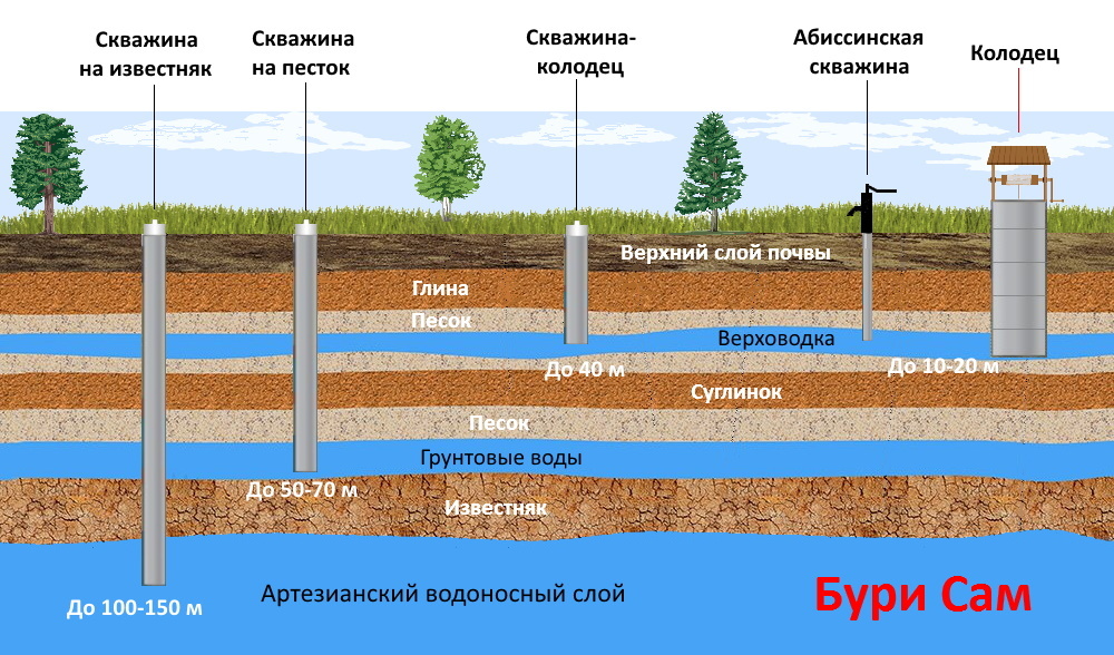 Скважина на песок - самый оптимальный тип скважины. Глубина залегания пластов воды в этом случае составляет от 30 до 50 метров. Если требуется обеспечить дом, баню, иные надворные постройки, а также большую семью, то лучше остановить свой выбор на скважине на песок. Дебита такой скважины будет достаточным и будет гарантия, что вода будет в семье в достатке. Пробурить такую скважину при помощи МГБУ достаточно несложно. Скважина на первый водоносный слой не требует разрешений и лицензий.